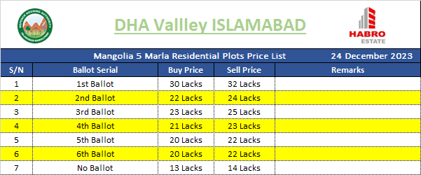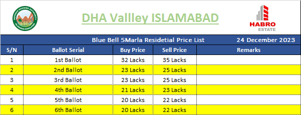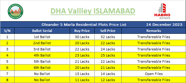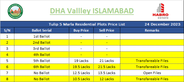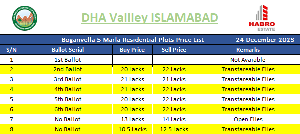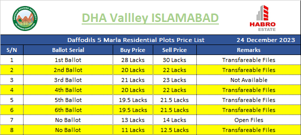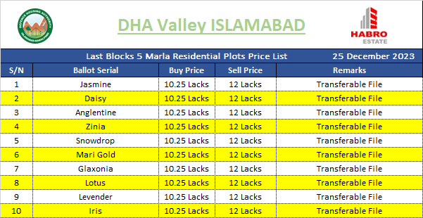 DHA Valley Last Blocks 5 Marla Residential Plots transferable Files Price List.