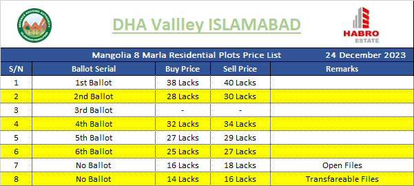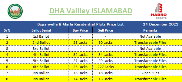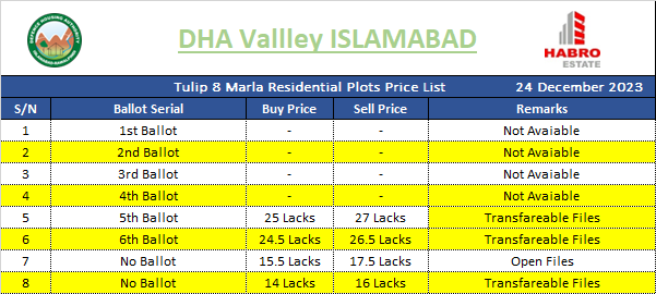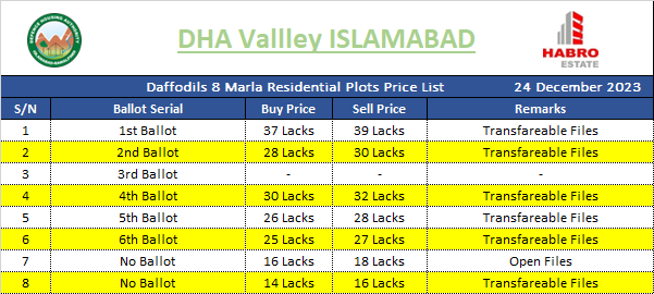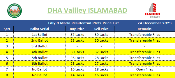 DHA Valley Last Blocks 8 Marla Residential Plots transferable Files Price List.
