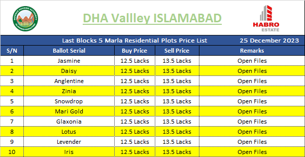 DHA Valley Last Blocks 5 Marla Residential Plots Open Files Price List.