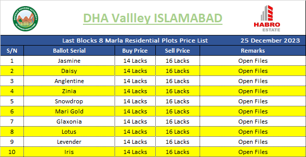 DHA Valley Last Blocks 8 Marla Residential Plots Open Files Price List.